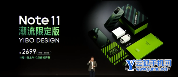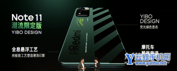 Redmi Note 11 潮流限定版基于 Redmi Note 11 Pro+ 打造,首发全息悬浮工艺,Logo 悬浮机身之上,并配有线条装饰,以及王一博 YIBO DESIGN 签名。