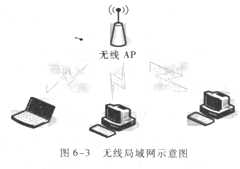 在无线网络的发展,从早期的红外线技术,到蓝牙(Bluetooth),都可以无线传输数据,多用于系统互联,但却不能组建局域网。如将一台计算机的各个部件(鼠标、键盘等)连接起来,再如常见的蓝牙耳机。如今新一代的无线网络,不仅仅是简单地将两台计算机相连,更是建立无需布线和使用非常自由的无线局域网WLAN(Wireless LAN)。在WLAN中有许多计算机,每台计算机都有一个无线调制解调器和一个天线,通过该天线,它可以与其他的系统进行通信。通常在室内的墙壁或天花板上也有一个天线,所有机器都与它通信,然后彼此之间就可以相互通信了,如图6—3所示。