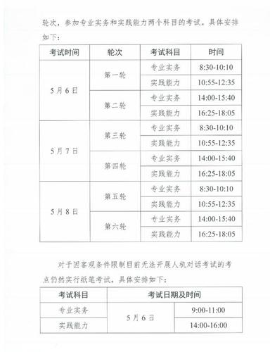 根据全国2017年护士执业资格委员会发布的公告,2017年护士执业资格考试将全面实施人机考试,人机考试时间定于5月6-8日举行,每半天为一个轮次,分为6轮依次进行,考生将随机分配至其中一个轮次,参加专业实务和实践能力两个科目的考试。部分地区因为客观原因仍实行纸笔考试,纸笔考试时间定于5月6日。具体时间安排如下:
