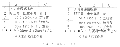 双击工作表标签,输入新的名字即可,或者鼠标右键单击要重新命名的工作表标签,在弹出的菜单中选择“重命名”命令,输入新的名字即可。例如,将“人力资源情况表”所在的Sheetl工作表重新命名为“人力资源情况表”.如图4—12(a)、(b)所示。