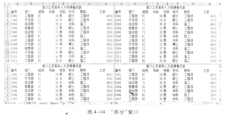 一个工作表窗口可以拆分为“两个窗口”或“四个窗口”,如图4—14所示,分隔条将窗格拆分为四个窗格。窗口拆分后,可同时浏览一个较大工作表的不同部分。拆分窗口的具体操作是: