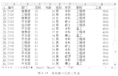 利用“视图”选项卡内“窗口”命令组的“冻结窗口”命令内的操作还可以冻结工作表的首行或首列。图4一l5为冻结首行后的工作表。