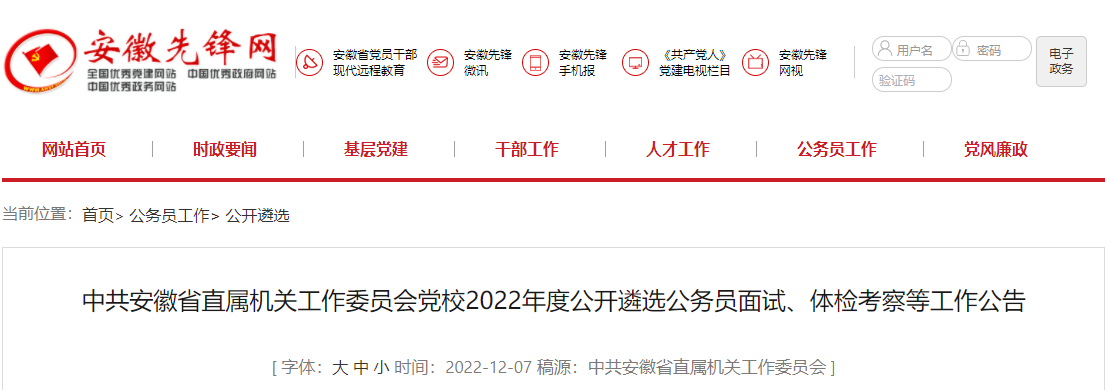原文标题:中共安徽省直属机关工作委员会党校2022年度公开遴选公务员面试、体检考察等工作公告
