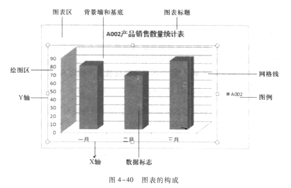 创建图表主要利用“插入”选项卡下的“图表”命令组完成。当生成图表后单击图表,功能区会出现“图表工具”选项卡,其下的“设计”、“布局”、“格式”选项卡可以完成图表图形颜色、图表位置、图表标题、图例位置、图表背景墙等的设计和布局以及颜色的填充等格式设计。