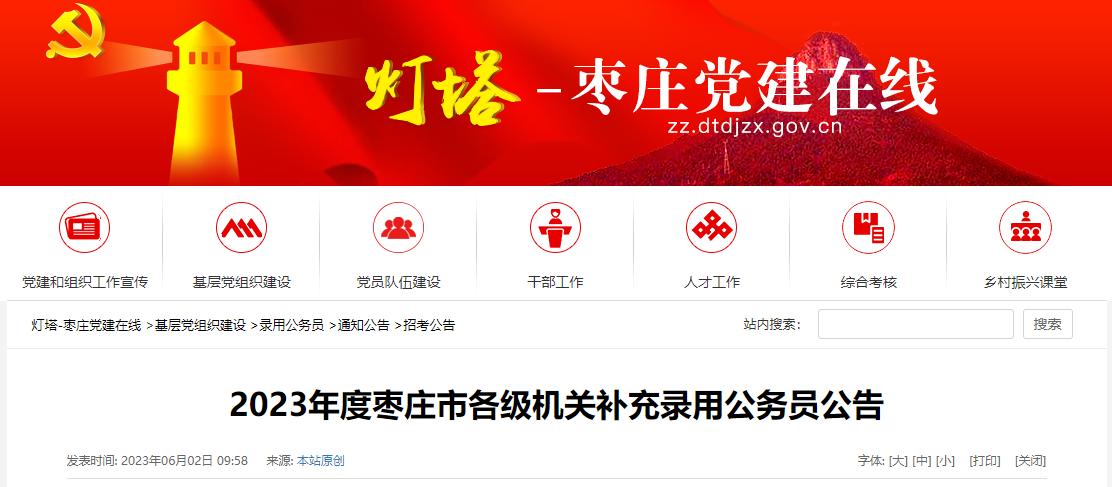 【#公务员考试# 导语】®文档大全网从灯塔—枣庄党建在线获悉,根据2023年山东枣庄市各级机关招录公务员公告,现面向社会统一进行补充录用,更多事宜请参考阅读《考试公告》,官方公告原文如下:
