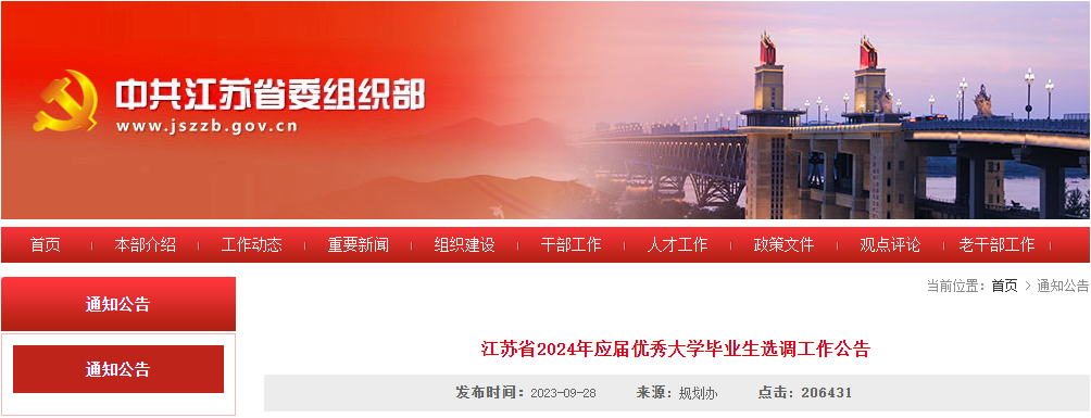 为加大优秀年轻干部发现储备力度,加强高素质专业化干部队伍源头建设,根据选调生工作有关规定,现就江苏省2024年应届优秀大学毕业生选调工作公告如下。