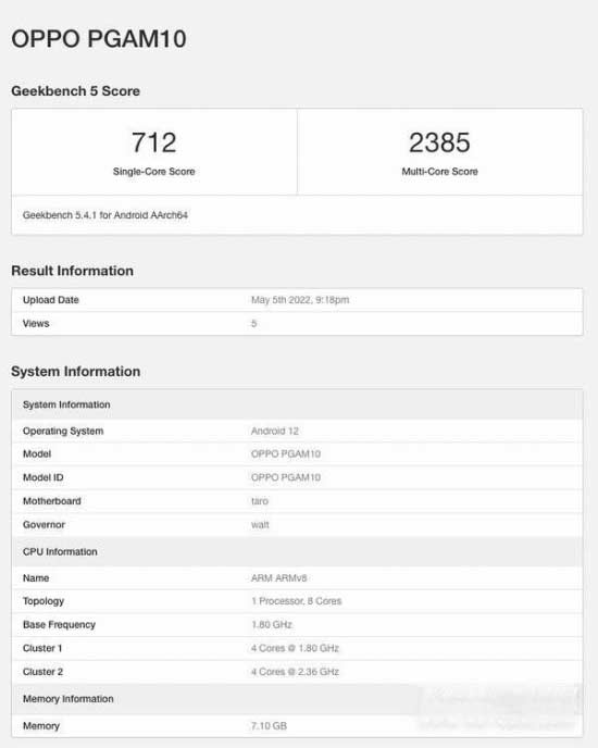 从 Geekbench 跑分来看,该机将搭载高通骁龙 7 Gen 1 芯片,运行 Android 12 系统,配备 8GB RAM。