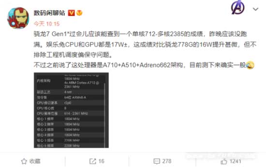 根据 @数码闲聊站 的说法,骁龙 7Gen1 对于目前主流骁龙 778G 提升几乎没有。