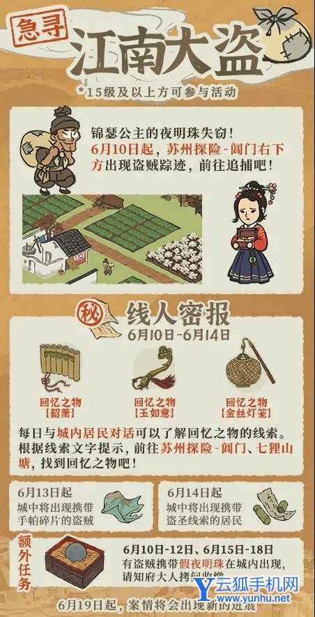 - 6月10日-6月14日,每日与城内居民对话可搜集到【回忆之物】相关线索,根据线索上的文字提示,前往 苏州探险-阊门/七狸山塘 附近寻找【回忆之物】吧;
