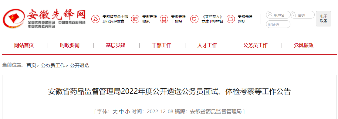 2022年安徽省药品监督管理局公开遴选公务员资格复审时间:12月13日-14日12-09