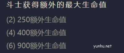 当同时拥有二个斗士、四个斗士、六个斗士的时候羁绊效果分别为:斗士额外获得200、400、900的生命值。(如下图所示)