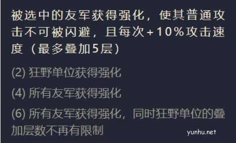 二狂野效果:随机选中的友军,友军开局将会提升攻速,普通攻击敌人无法闪避,最高叠加五层。