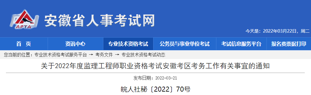 【#监理师考试# 导语】®文档大全网从安徽省人事考试网了解到,《2022年安徽监理工程师职业资格考试考务工作通知》现已发布,2022年安徽监理工程师报名时间:3月22日-29日,考试时间:5月14日-15日,®文档大全网小编现将报考信息发布如下: