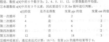 变量i是循环变量,变量终值等于数组中元素的个数,a[i]是一个一维数组;变量pjz表示平均值;变量cnt是一个记数变量。if是一个条件判断语句,此处假设判断a[i]是不是偶数。(注:pjz和cat的初始值一般都是0,此处省去了该变量的赋值语句。)