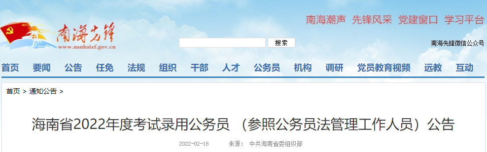 【#公务员考试# 导语】南海先锋网发布了《2022年海南省考试录用公务员 (参照公务员法管理工作人员)公告》,®文档大全网从公告中获悉,2022年海南公务员报名时间:2月21日-25日,考试时间:3月26日-27日,具体事宜详见《招考公告》,®文档大全网小编在此将相关信息摘录如下,预祝大家顺利成“公”!