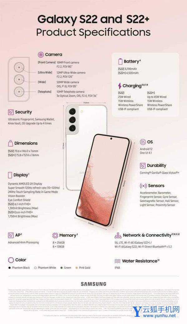 两款手机几乎是没有太大的区别,处理器都是骁龙8和猎户座2200,存储是8+128GB和8+256GB,配色有幻影黑、幻影白、绿色和粉色。