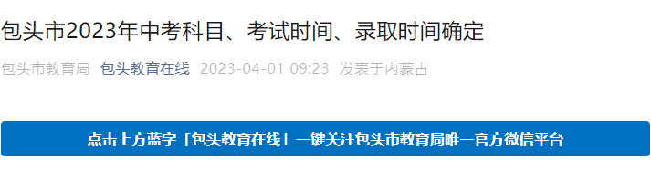 近日,包头市教育局印发《包头市2023年初中学业水平考试暨八年级生物、地理结业考试与高中阶段学校招生工作方案》,2023年中考科目、考试时间和网上录取时间确定。