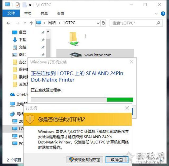 我们点击进入A电脑,输入A电脑的系统登录账户名和密码,点击共享的打印机(也就是刚刚我们的设置“www.lotpc.com”的共享名),并安装打印机驱动程序,如下图所示。