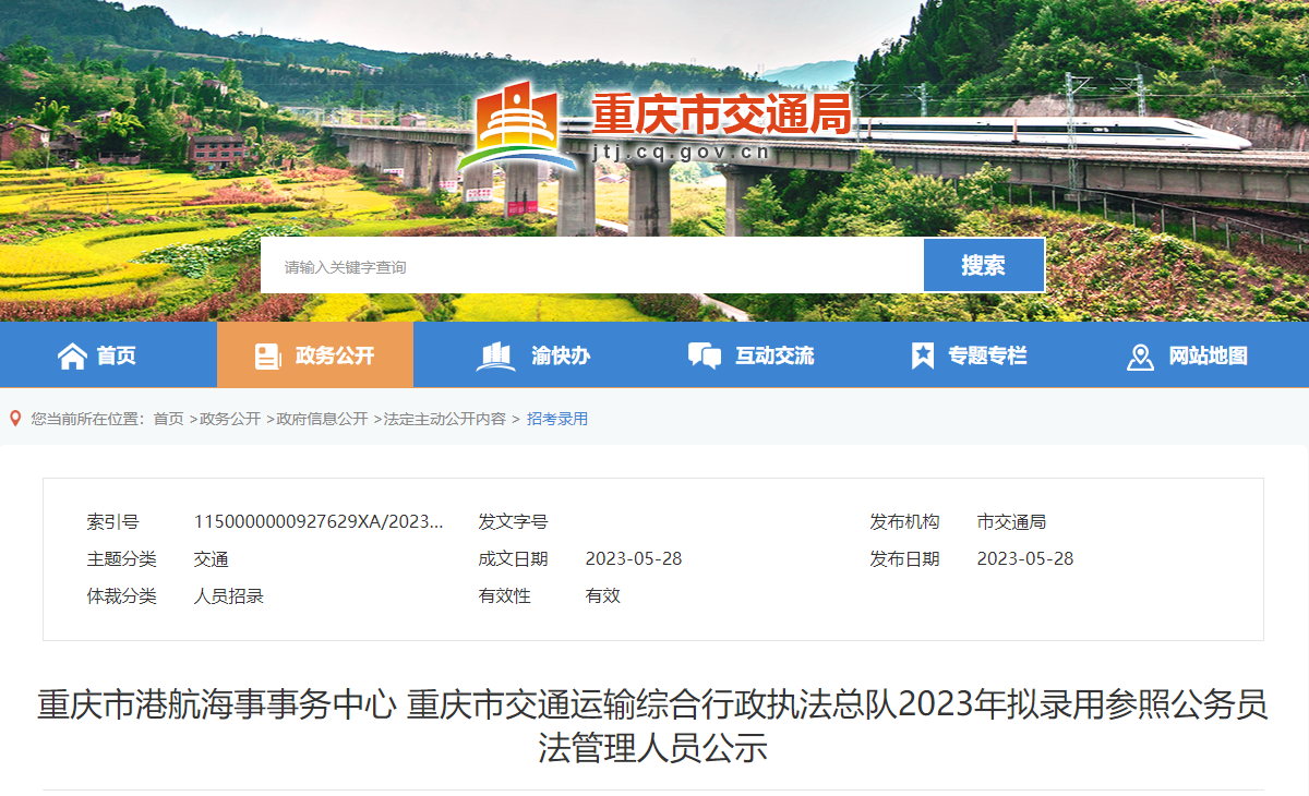 按照《重庆市2023年度公开考试录用公务员公告》要求,现将重庆市港航海事事务中心、重庆市交通运输综合行政执法总队拟录用参照公务员法管理人员名单予以公示。