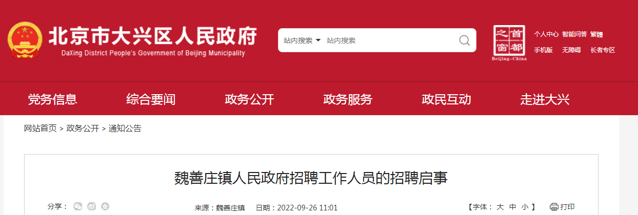 2022年北京市大兴区魏善庄镇人民政府招聘工作人员的招聘公告09-27