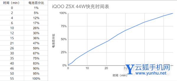 虽然它用的慢,可是它充的快呀,iQOO Z5x 搭载的 44W 快充可以在大约 30 分钟充到 67%,大约 55 分钟内从 1% 充到 100%,这个日常使用相当安心。