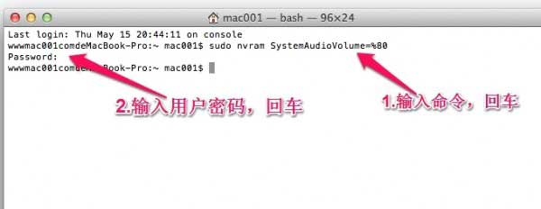 2、之后会提示输入密码,输入你的用户密码,回车,如下图。这样之后再次启动Mac的时候就是完全静音的了。