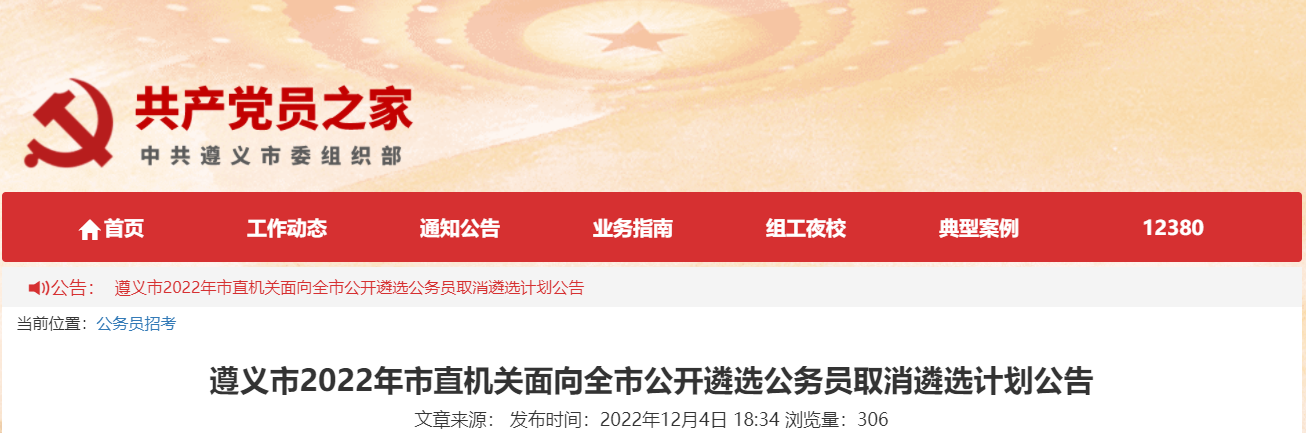 2022年贵州遵义市直机关公开遴选公务员取消遴选计划公告12-06