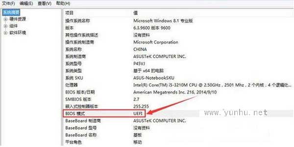 2、在打开的系统信息窗口,点击“系统摘要”,在右侧窗口可以看到bios模式,如果显示“传统”,表示系统启动方式为传统legacy bios,如果显示uefi,则是uefi bios。