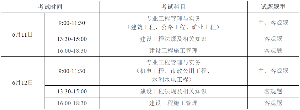 注:1.《专业工程管理与实务》科目分为建筑工程、公路工程、水利水电工程、矿业工程、市政公用工程、机电工程6个专业,报考人员可根据实际工作需要选报其一。