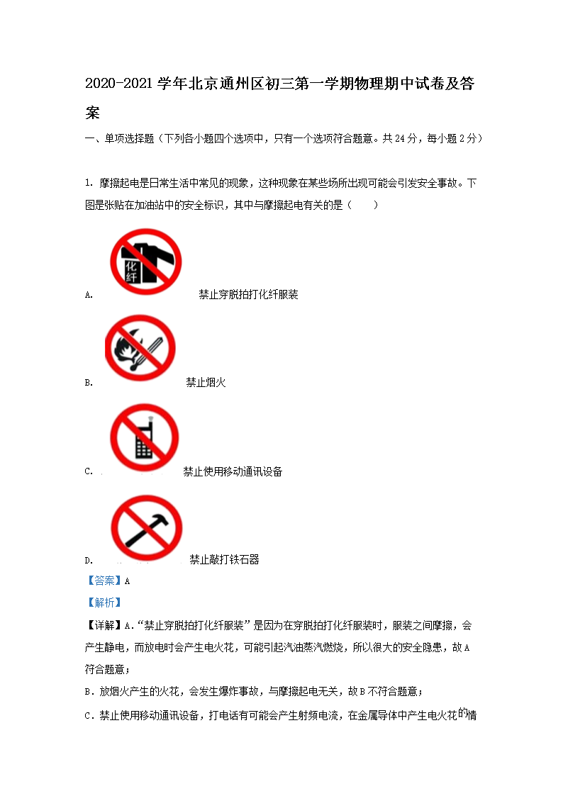 2020-2021学年北京通州区初三第一学期物理期中试卷及答案(Word版)08-11