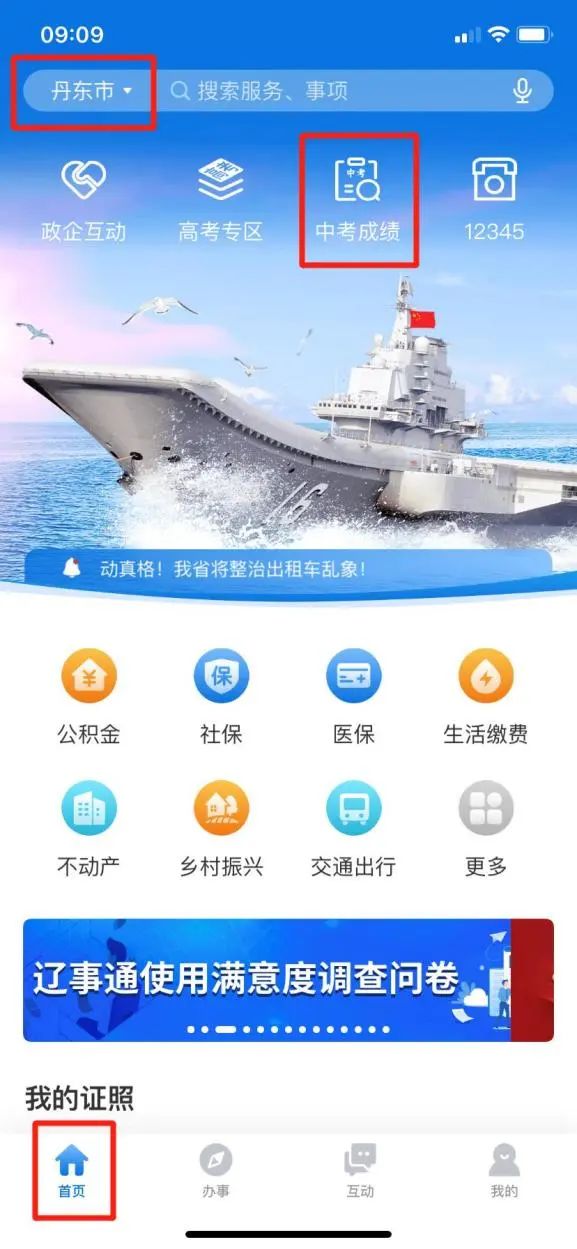 辽事通App首页滚动图片,点击中考成绩查询: