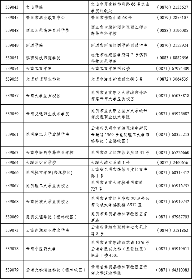 注:本次考试云南财经大学、保山学院、昭通学院、云南中医药中等专业学校、大理州财贸学校、云南中医药大学、云南工程职业学院7个考点接受社会考生报考,其他考点只接受本校在校生报考。