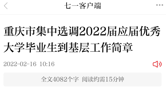 【#选调生# 导语】®文档大全网从七一网获悉,结合重庆经济社会发展和干部队伍建设需要,经研究,决定选调一批2022届应届普通高校大学本科及以上学历毕业生到基层工作。报名时间:3月1日-5日,考试时间:3月19日,更多事宜请参考阅读《考试公告》,官方公告原文如下: