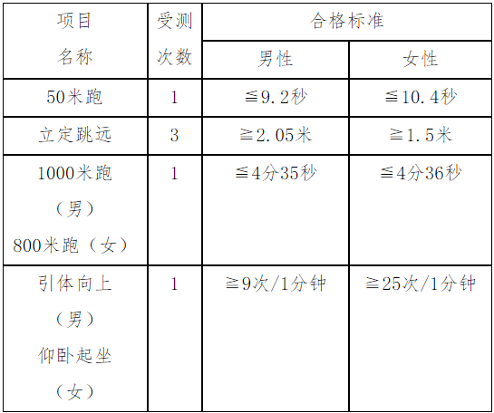 (注:以上4个项目中有3个及以上达标的,体能测评结论为合格)