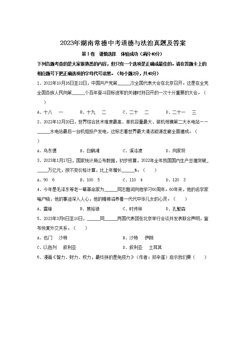 【文档预览】 文档大全网整理发布2023年湖南常德中考道德与法治真题及答案(Word版),前五页预览如下: