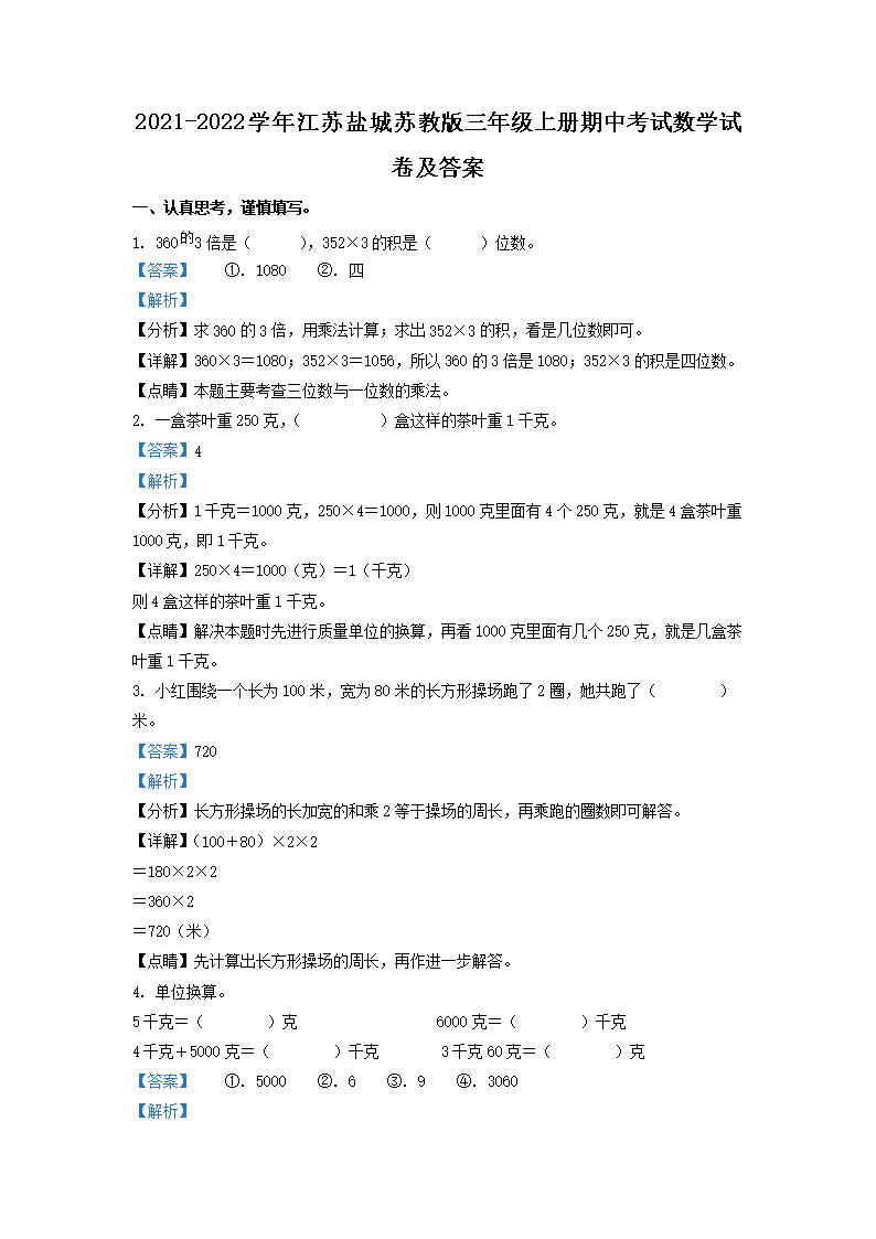 【文档预览】 文档大全网整理发布2021-2022学年江苏盐城苏教版三年级上册期中考试数学试卷及答案(Word版),前五页预览如下: