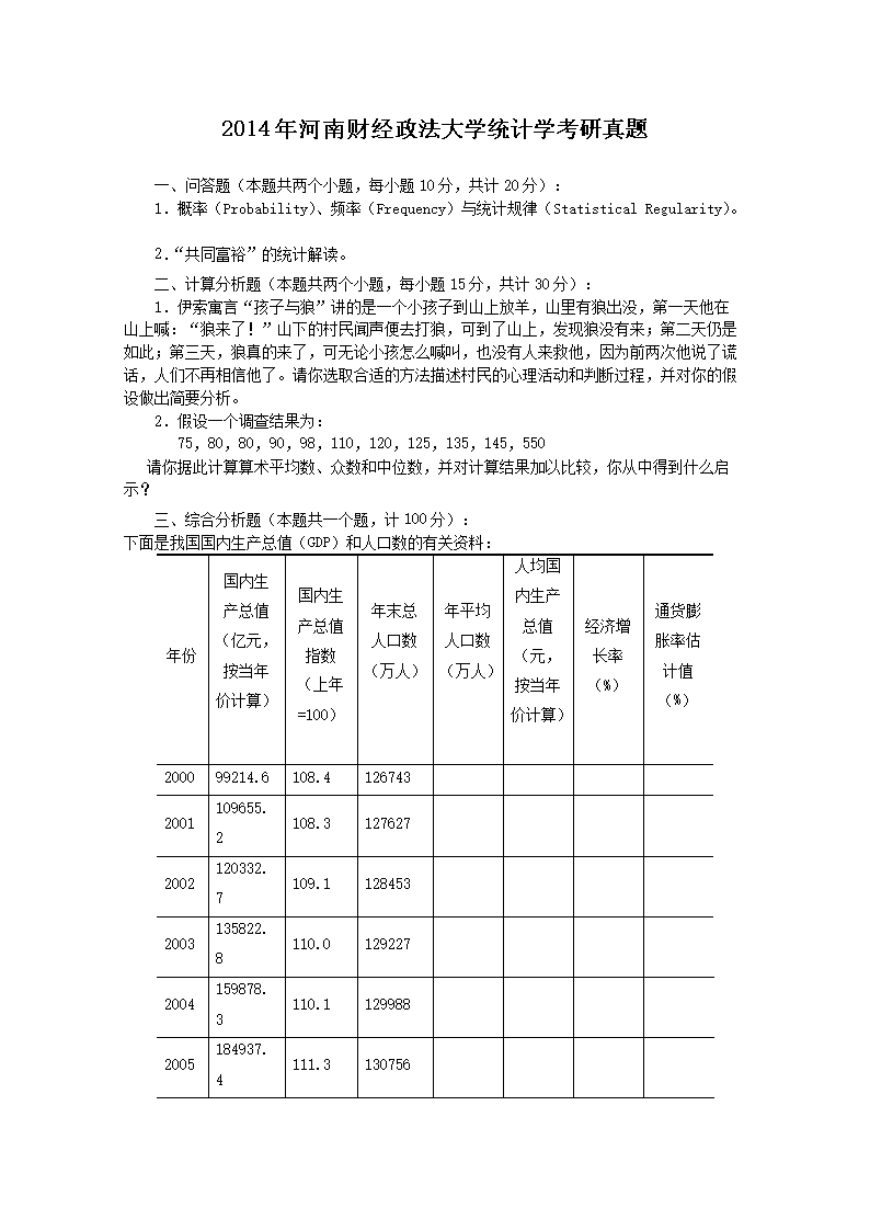 2014年河南财经政法大学统计学考研真题(Word版)06-20
