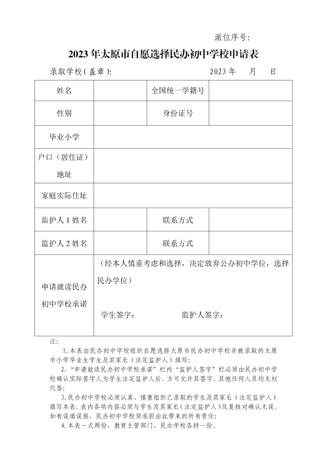 填写完毕的《2023年太原市自愿选民办初中学校申请表》2份(后附样表,保存图片打印)
