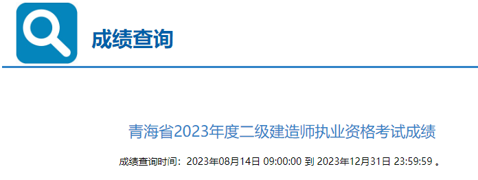 2023年青海二级建造师考试成绩查询时间:8月14日起,报考人员通过“青海省人事考试信息网(www.qhpta.com)”查询考试成绩!