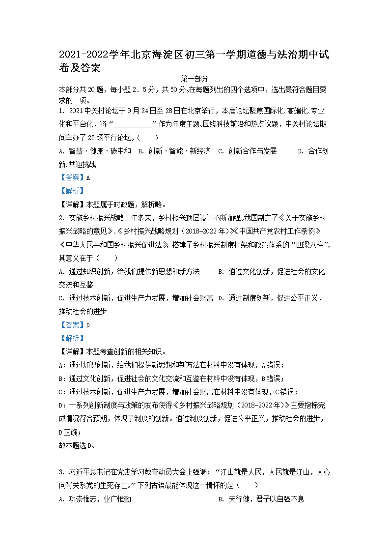 【文档预览】 文档大全网整理发布2021-2022学年北京海淀区初三第一学期道德与法治期中试卷及答案(Word版),前五页预览如下: