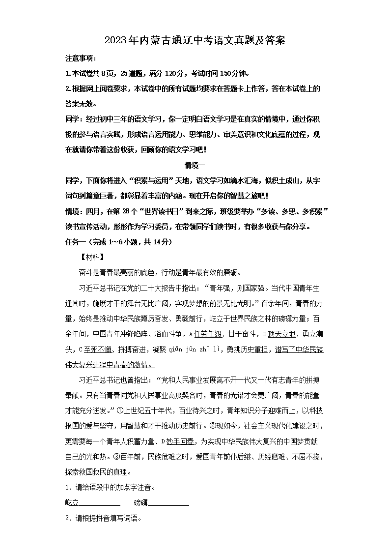 2023年内蒙古通辽中考语文真题及答案(Word版)07-05