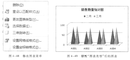 图表创建完成后,如果对工作表进行了修改,图表的信息也将随之变化。如果工作表没有变化,也可以对图表的“图表类型”、“图表源数据”、“图表选项”和“图表位置”等进行修改。当选中了一个图表后,功能区会出现“图表工具”选项卡,其下的“设计”、“布局”、“格式”选项卡内的命令可编辑和修改图表,也可以选中图表后单击鼠标右键,利用弹出的菜单也可以编辑和修改图表,如图4—48所示。