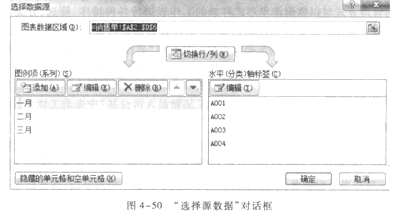 单击图表绘图区,选择“图表工具”选项卡下“数据”命令组的“选择数据”命令,或单击图表绘图区,选择图4-48所示的菜单中的“选择数据”命令,在弹出的“选择源数据”对话框中(如图4-50所示)重新选择图表所需的数据区域,即可完成向图表中添加源数据,如图4—51所示。