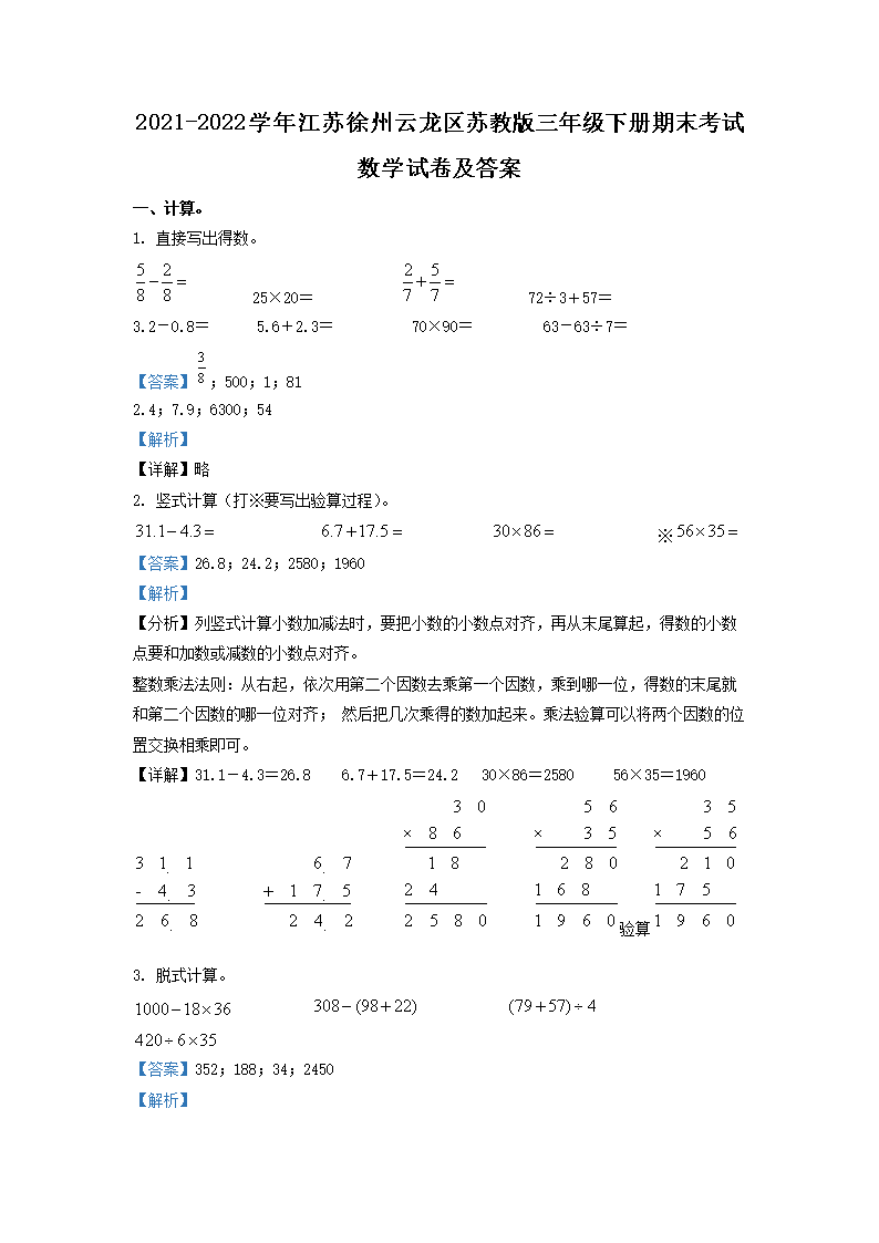 2021-2022学年江苏省徐州市云龙区苏教版三年级下册期末考试数学试卷及答案(Word版)07-11