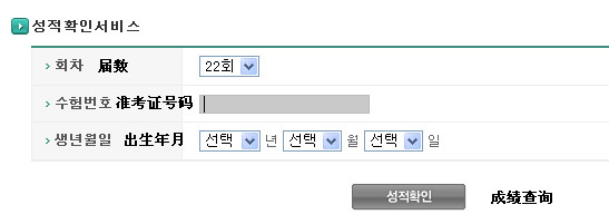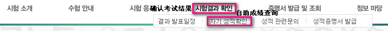 选择导航栏中的“确认考试结果(시험결과 확인)”→“自助成绩查询(자기 성적확인)”