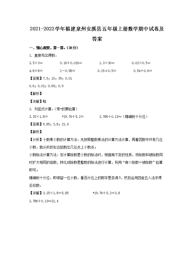 【文档预览】 文档大全网整理发布2021-2022学年福建泉州安溪县五年级上册数学期中试卷及答案(Word版),前五页预览如下: