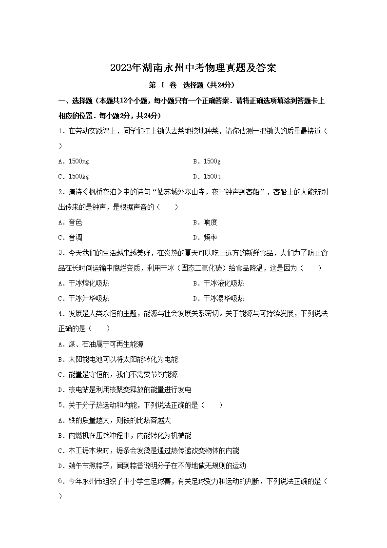 【文档预览】 文档大全网整理发布2023年湖南永州中考物理真题及答案(Word版),前五页预览如下: