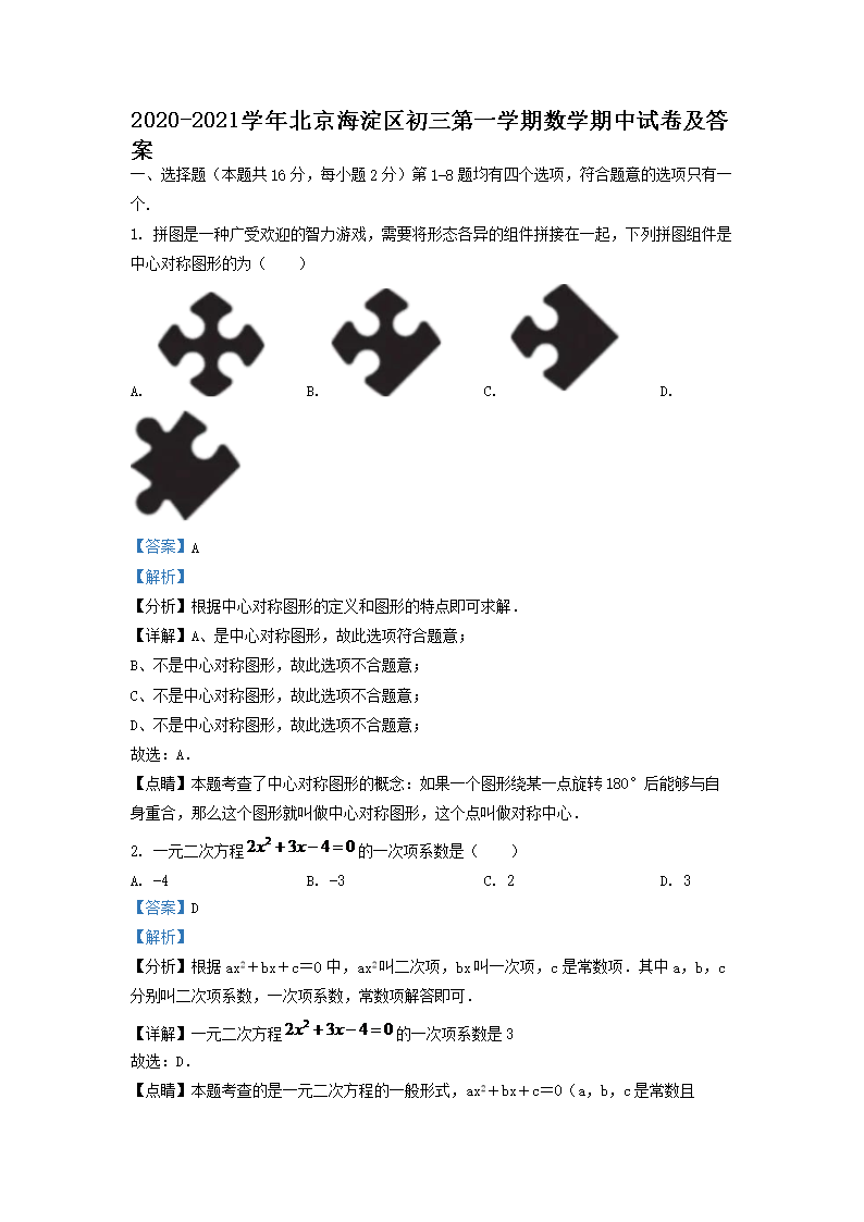2020-2021学年北京海淀区初三第一学期数学期中试卷及答案(Word版)07-28