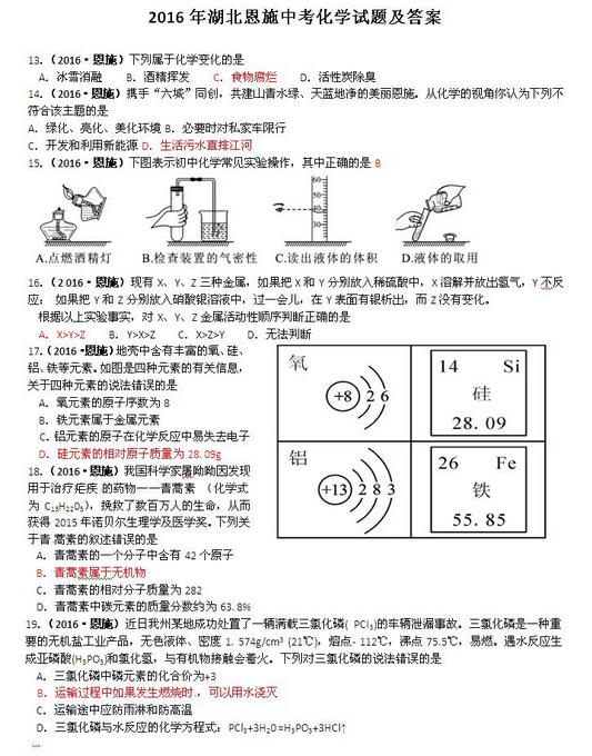 2016湖北恩施中考化学试题(已公布)04-10