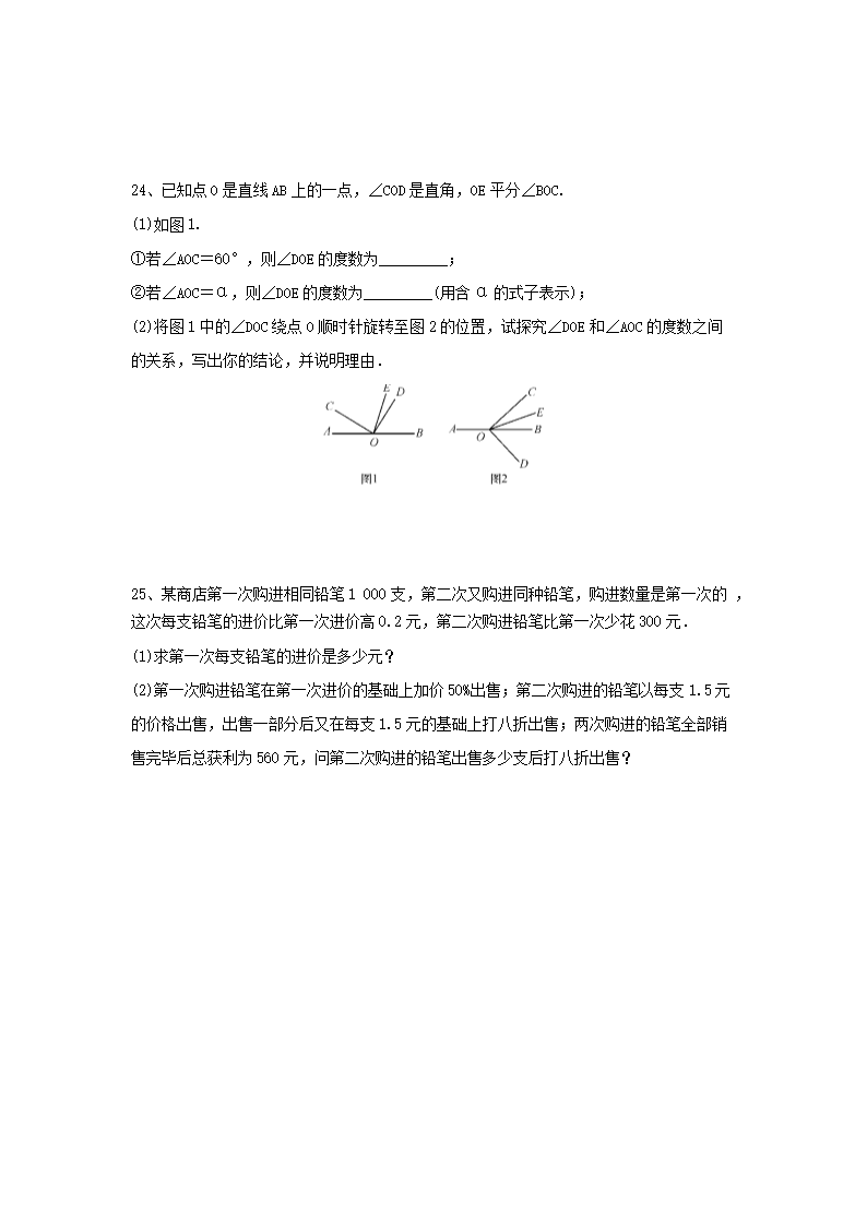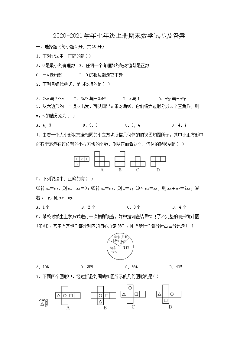 2020-2021学年七年级上册期末数学试卷及答案(Word版)08-31
